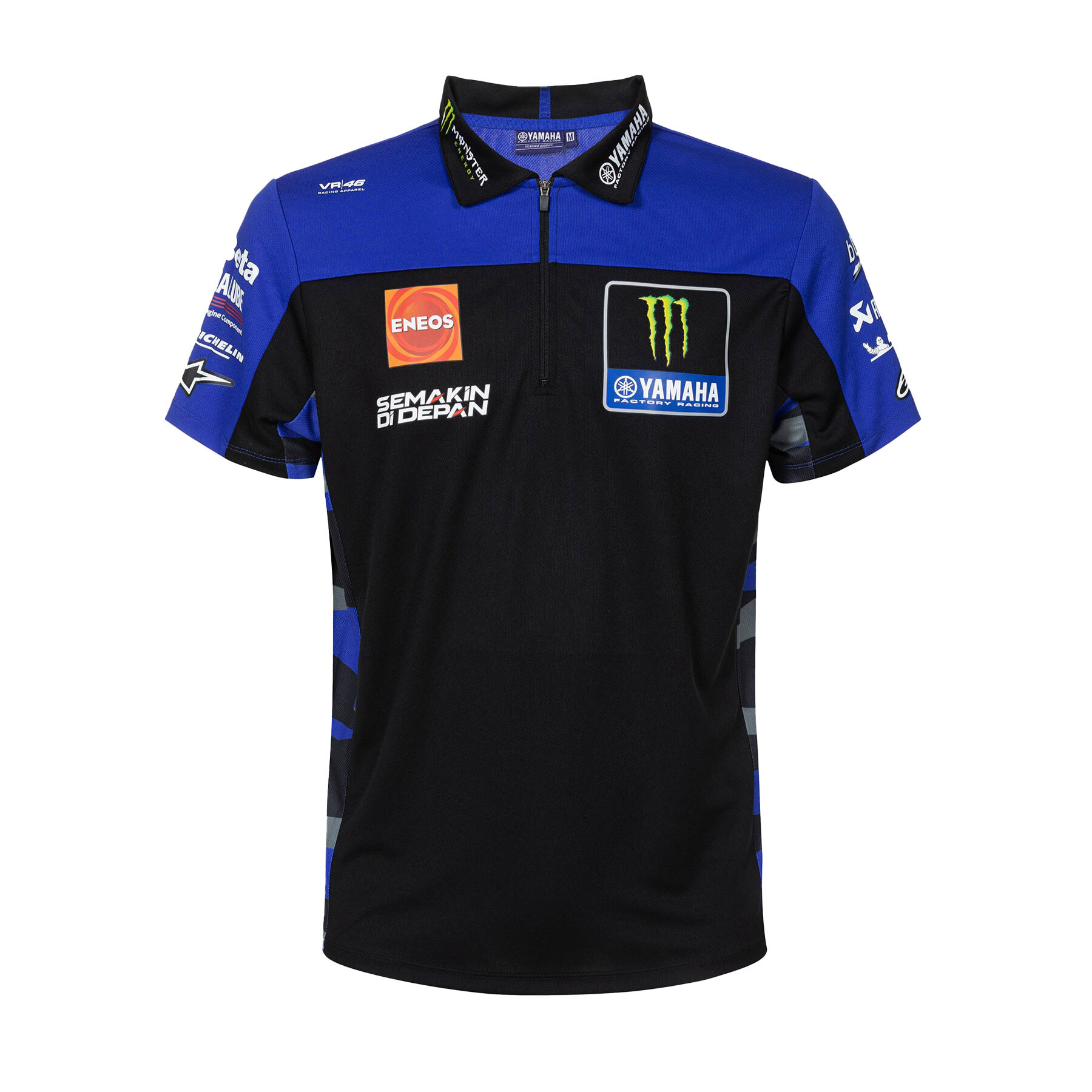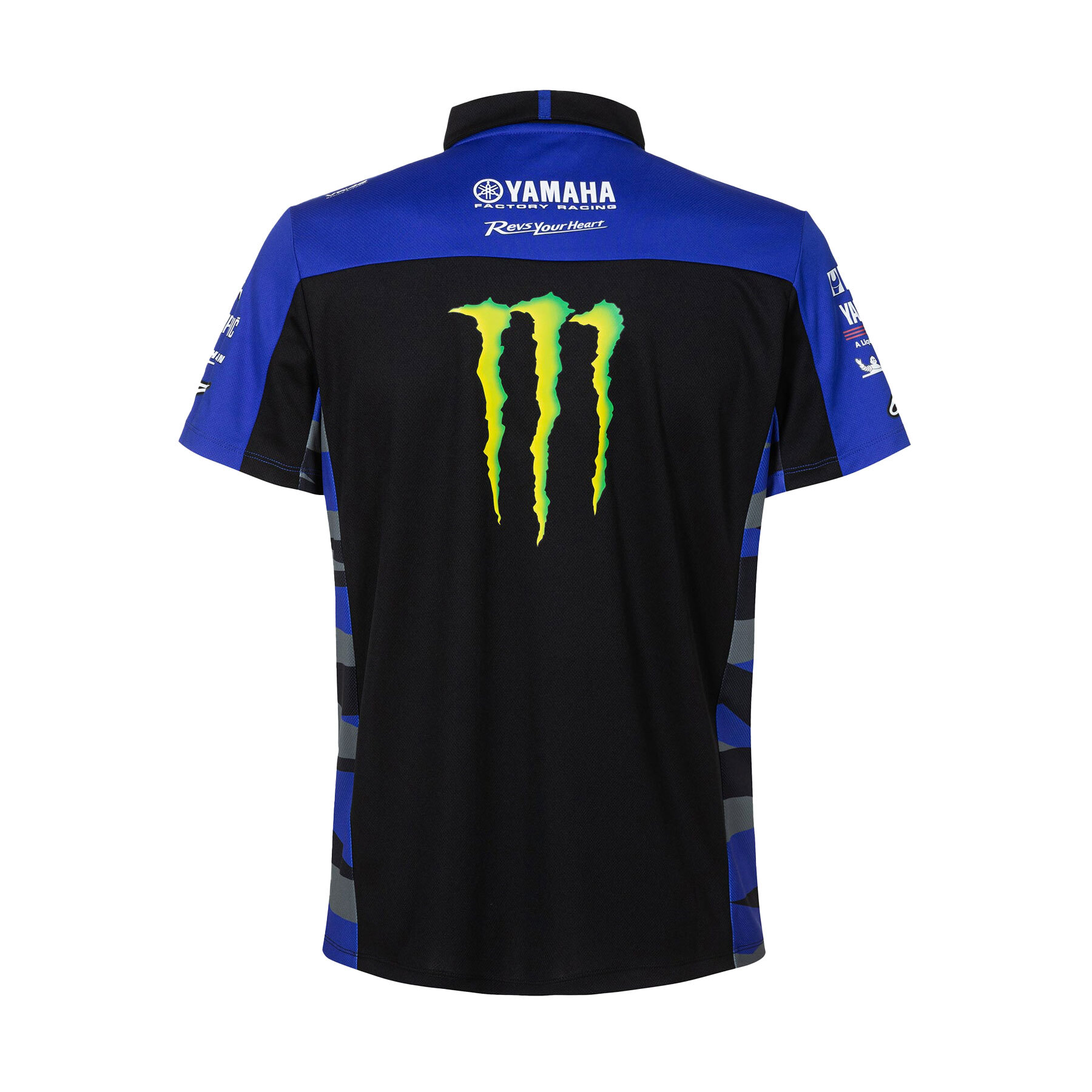 Official replica of the polo shirt worn by the Monster Energy Yamaha MotoGP Team of Franco Morbidelli and Fabio Quartararo in the 2023 season. It is made of technical polyester fabric.