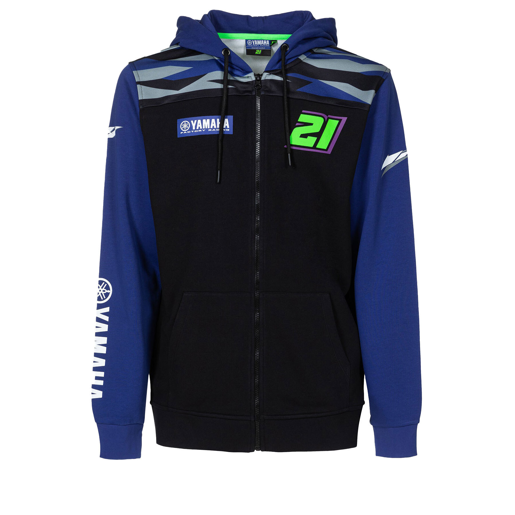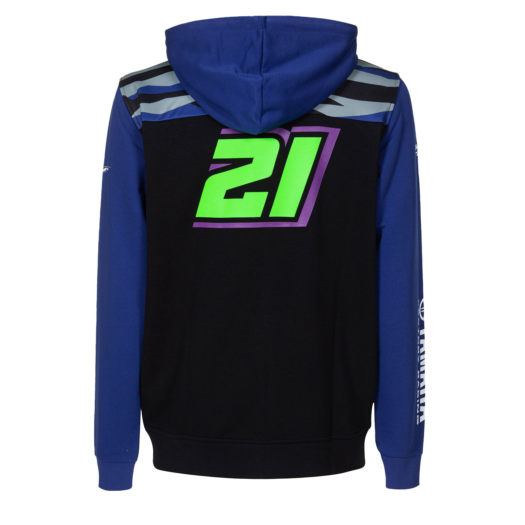 Cotton and polyester hoodie from Franco Morbidelli's Dual Yamaha collection. The sweatshirt features a full zip and two front pockets. The Yamaha racing logo and the number 21 are printed on the front and back. On the right sleeve is the Yamaha Racing logo and the YZR-M1 logo, also repeated on the left sleeve. The hood and sleeves are contrasting blue. At the top, on the front and back, the graphic elements that distinguish the Yamaha M1 2023.
